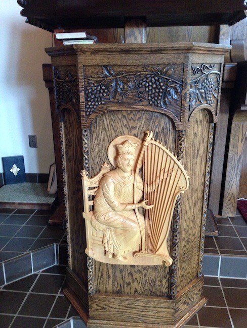 This traditional Greek Orthodox chantor's stand features cabinets and a two-sided rotating top in oak and basswood. This is a piece of liturgical furniture built to display and store books during service. Built and carved by Dimitrios and dedicated to his parents, this piece was donated to St. Luke’s Greek Orthodox Church in East Longmeadow, Massachusetts. The grapevine is a recurring theme in liturgical furniture, in reference to the scripture, “I am the vine, ye are the branches: He that abideth in me, and I in him, the same bringeth forth much fruit.” And so the oak stand itself depicts the vine and grapes. The bas relief depicts King David, with his harp, the composer of the Psalms. This was carved from a two inch thick slab of contrasting basswood, secured from the inside with screws.
