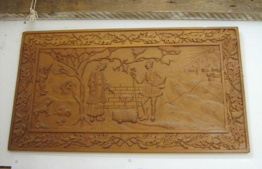 Carved in basswood, by Dimitrios, this piece illustrates village life, focused on the spring, the source of life. The border is decorated with white oak leaves and acorns and the spring is shaded by a standing sugar pine.