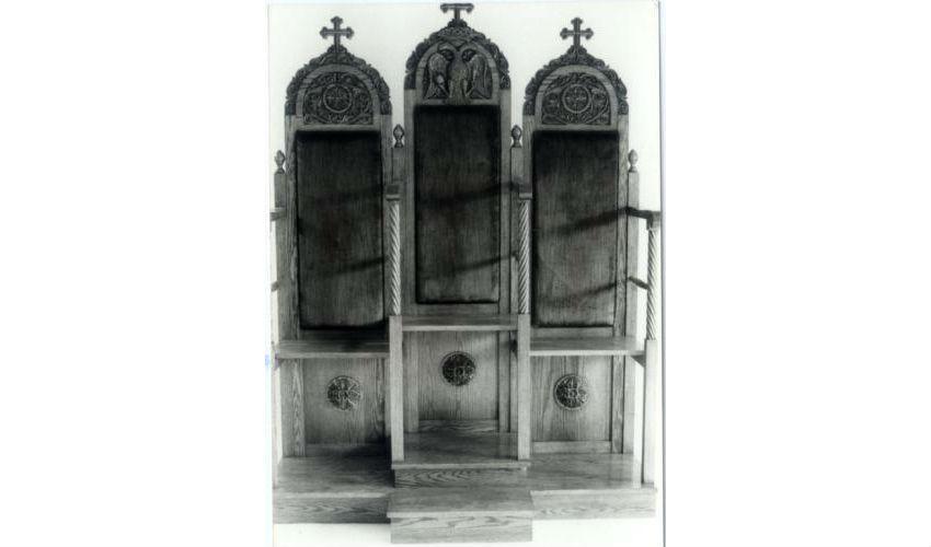 This psaltery was produced out of oak and decorated with rosettes and similar architectural ornament, including a two headed eagle. For St. George's Roman Catholic Church in Manchester, New Hampshire.
