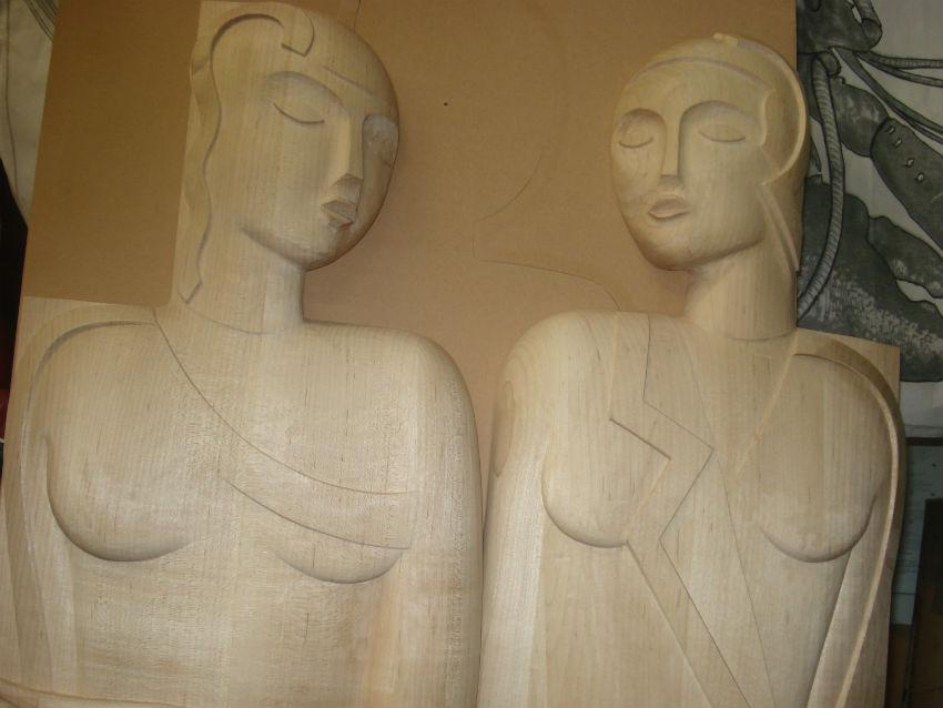 This pair of Art Deco female figures were carved in relief, out of basswood, and attached to heavy glass doors.