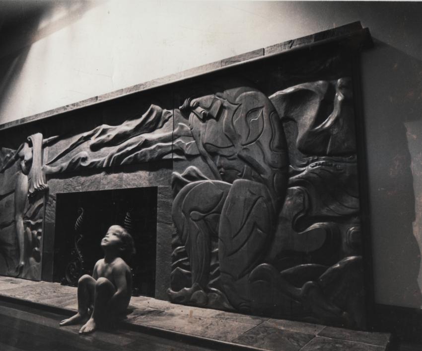 Produced from a sketch by New York architect Bill Green, this Art Deco fireplace surround was produced out of three sections of maple. Dimitrios took delivery of three sections, all two inches thick, from a New York woodworker. Total area of the fireplace surround was twelve feet by five feet.