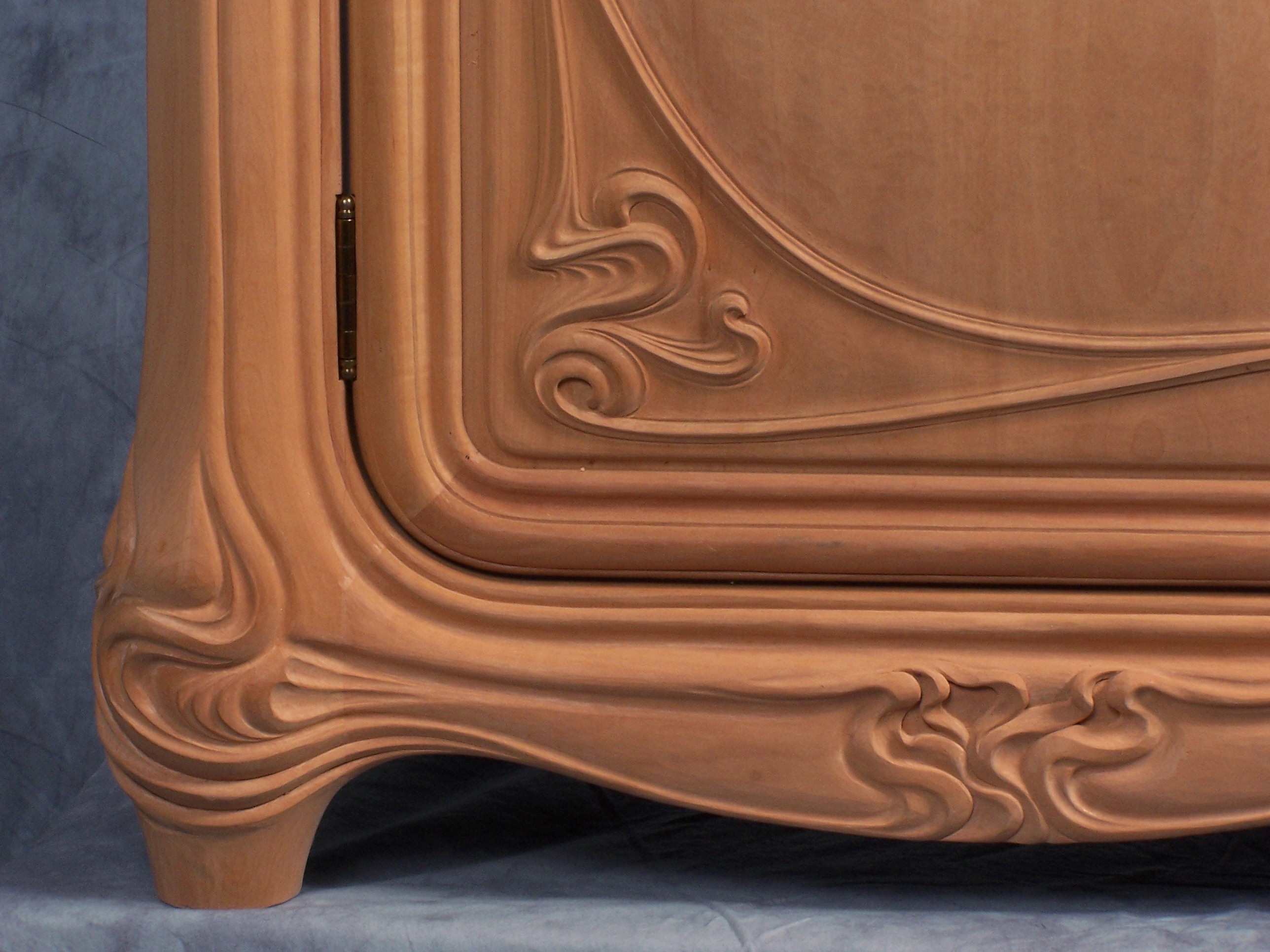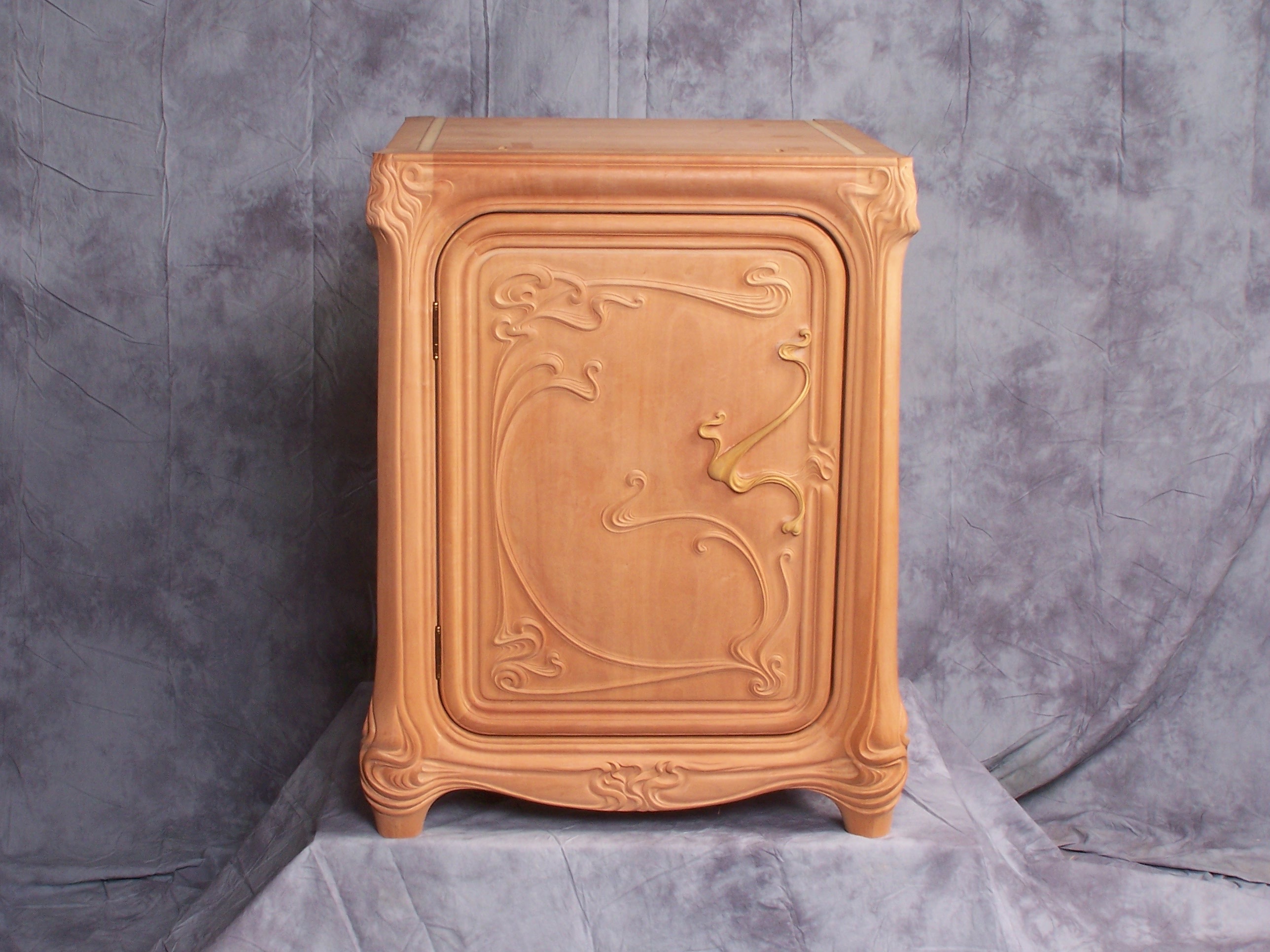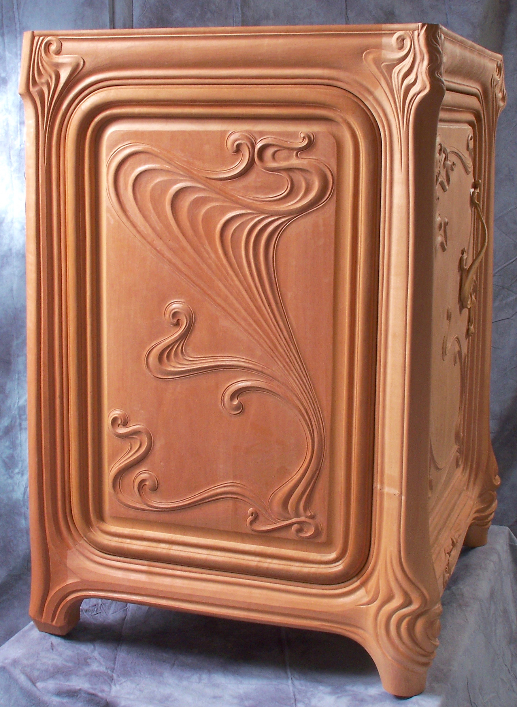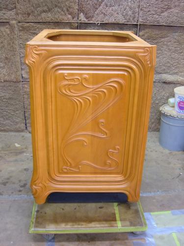 This vanity is the companion to the Art Nouveau Mirror. The vanity was created in a style to match the mirror, itself based upon and referencing a 1902 example seen in a New York gallery. More details on both can be seen at the link. Carved from pearwood.