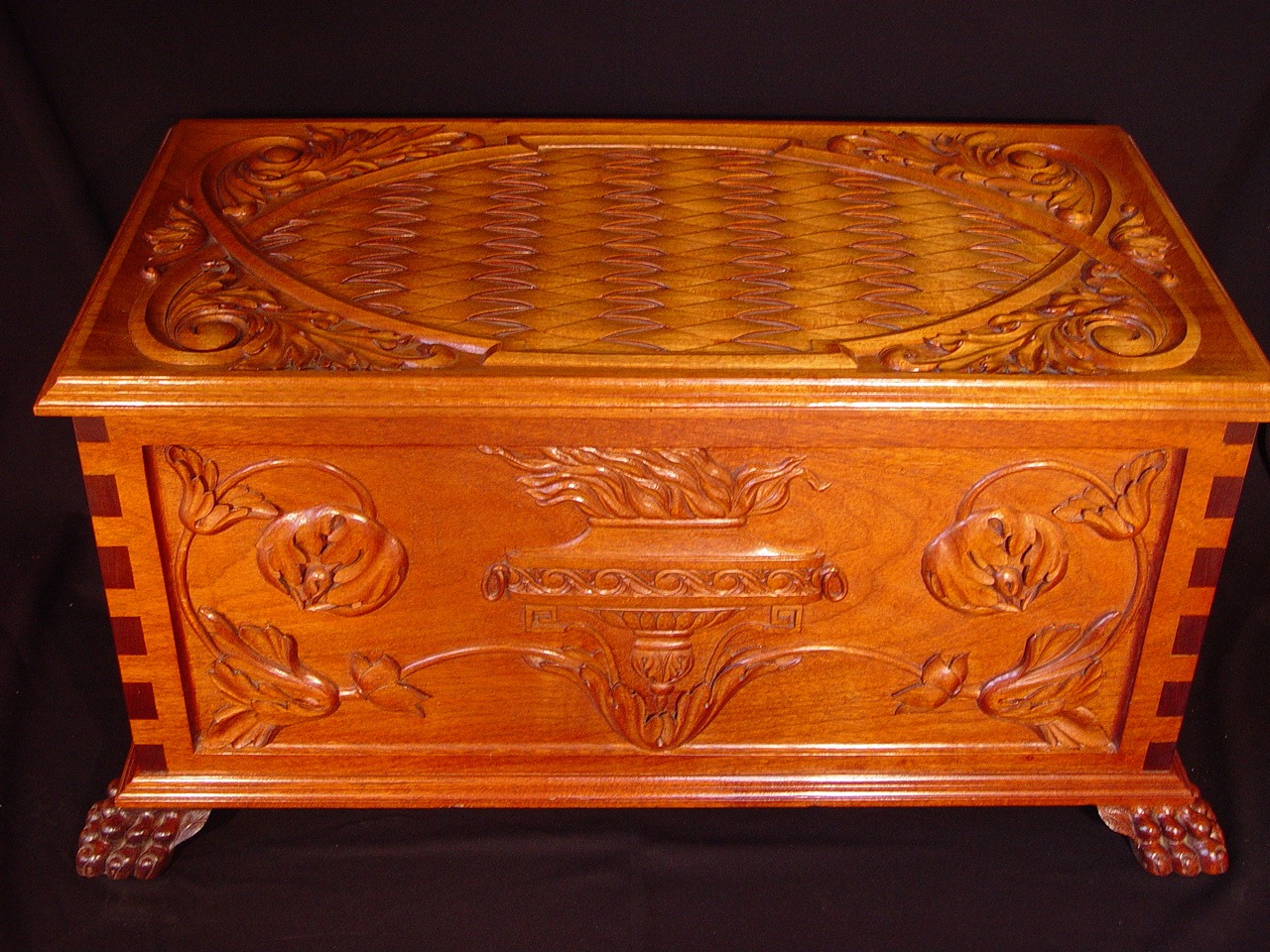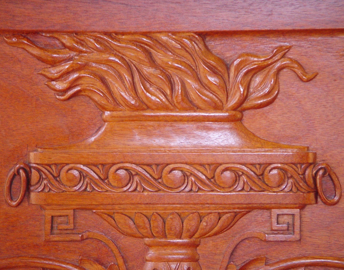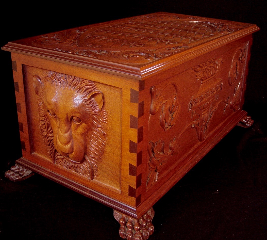 This chest was designed and built by Dimitrios, out of mahogany, in an eclectic Baroque style. It can be seen in his studio, as a show piece for patrons and students.
