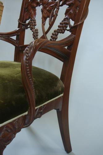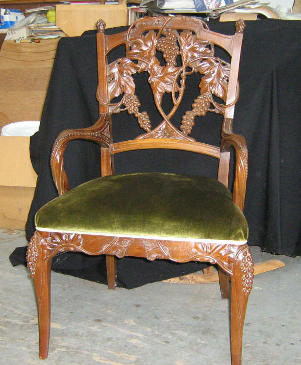A Massachusetts client had a large period dining table in mahogany and wanted to create a full set of chairs to match, ten chairs and two armchairs for the head of the table. They went to VCA, Inc. in Northampton, MA, a furniture maker, who built the chairs and brought them to Dimitrios. They furnished a picture of an example of the design that they wanted and Dimitrios developed it into a design that could be applied to the chairs. The woodworker and Dimitrios were so pleased with the work that they produced two extra, keeping one each for themselves, as showpieces.