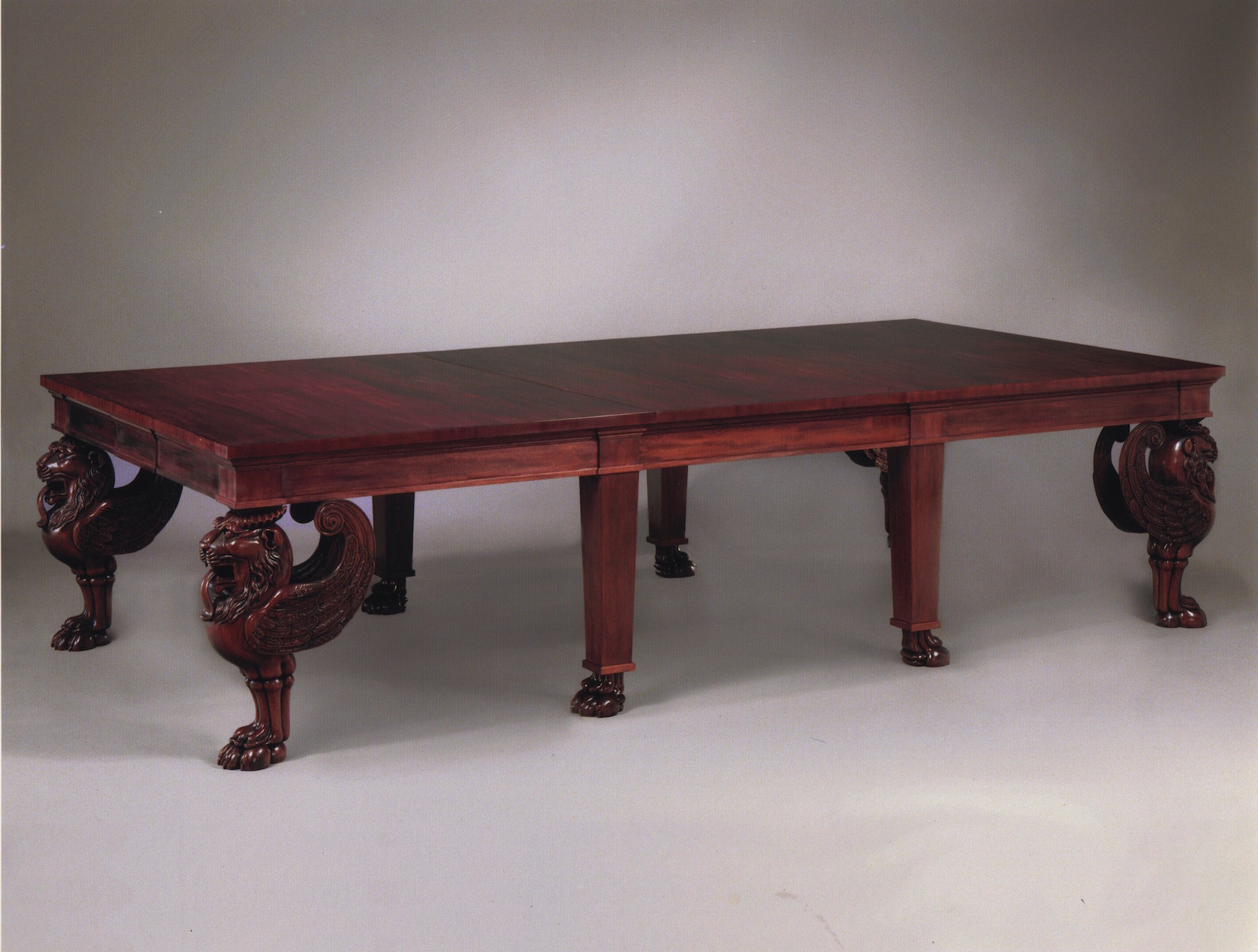 Carved out of mahogany, the richly carved table legs depict a rather comic lion’s head and terminates with a lion’s claw foot. A New York architect was commissioned to produce three massive (5’ x 11’) tables supported by the suitably massive lion’s head feet. The tables were fabricated by furniture maker VCA, Inc. in Northampton, MA and Dimitrios carved the legs for each. Much later, one of the tables found its way into a home in Florida, which was sold. The new owner asked if he could buy the table as well as the house, and was refused. He took a picture, researched the provenance and origin of the table and then commissioned VCA and Dimitrios to produce a fourth lion’s head table.