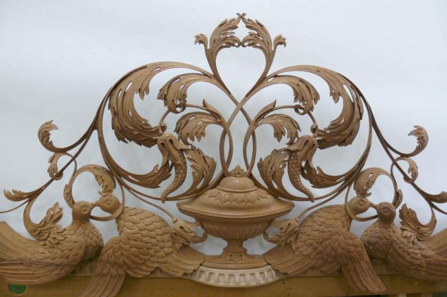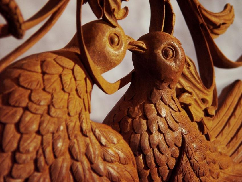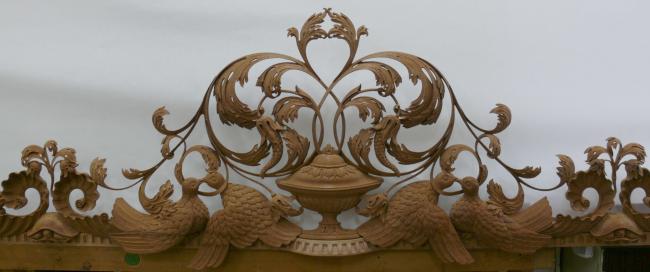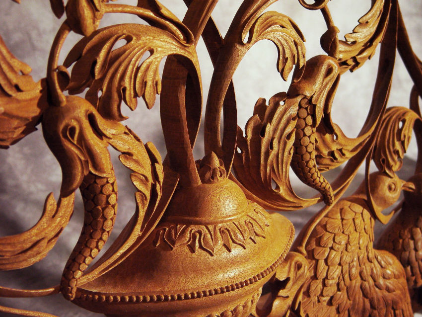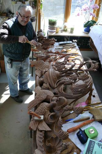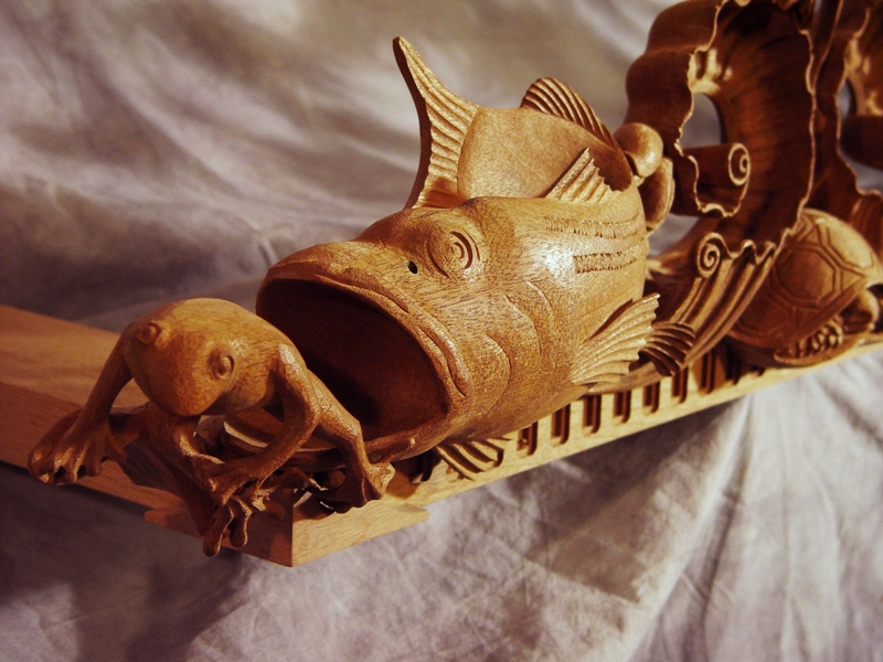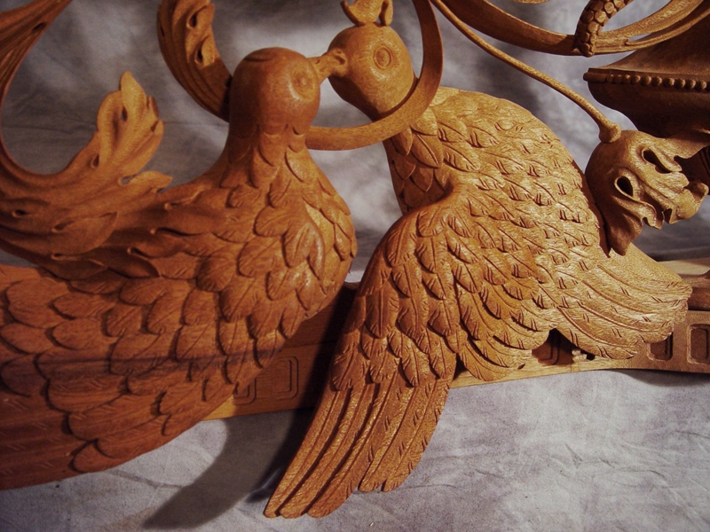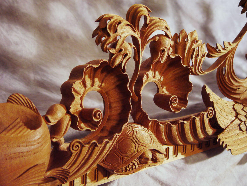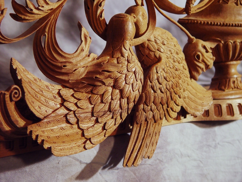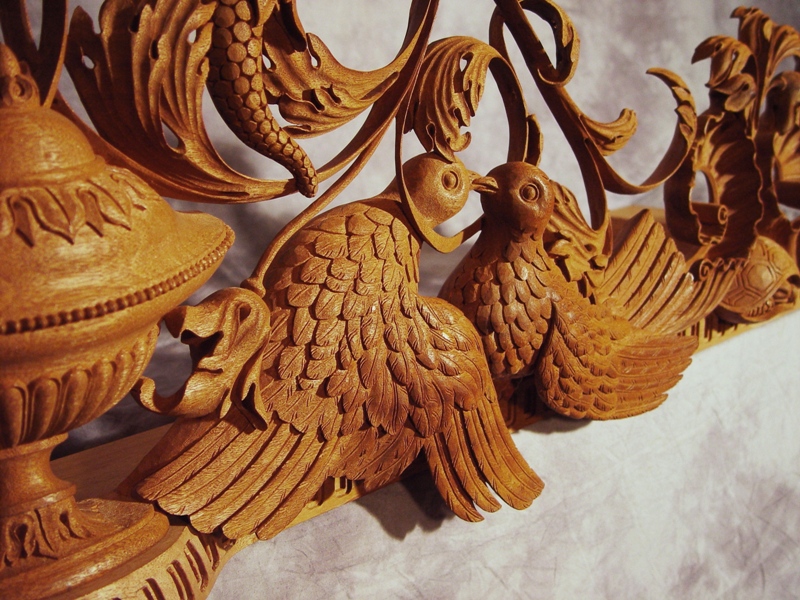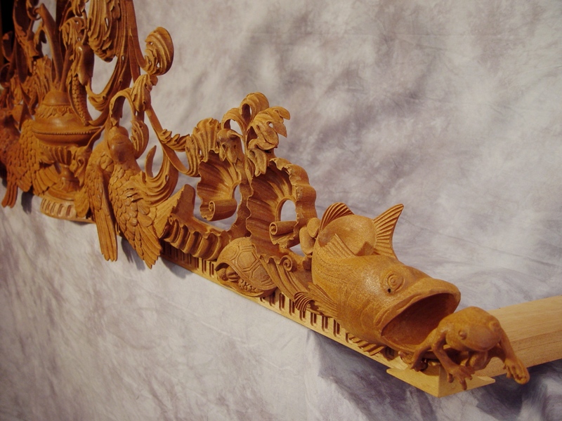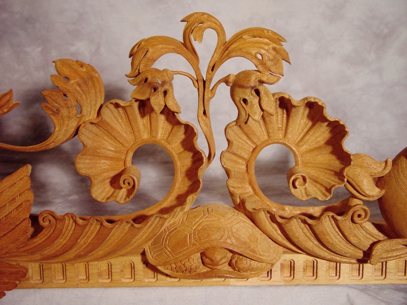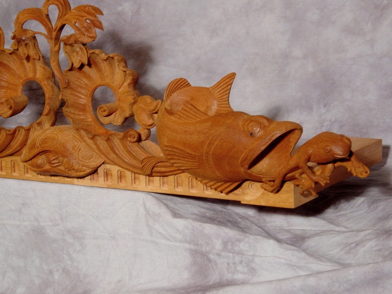 Dimitrios carved this pediment in the layered style of Grinling Gibbons for a nine foot bar cabinet in a new private home in Florida. The Gibbons style calls for pigeons and wildflowers, and the patron personalized it with fish and turtles with their heads and feet withdrawn. Flanking the pediment, two identical fish can be seen pursuing two identical frogs. Not shown are two three foot pediments carved to surmount two adjacent cabinets. These featured owls and fish, at the patron’s suggestion.
