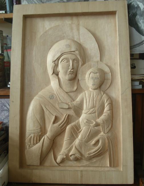 Large Mother and Child relief sculpture, as seen in the studio.