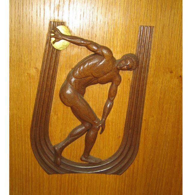 This oak cabinet was built by Dimitrios in an Ionic style (note pediment) and can be seen in his studio. He is an accomplished furniture maker and cabinetmaker as well as a master wood carver. It was designed to hold a part of his studio library, the books he consults with most frequency. Note the concealed reading table that pulls out, when needed. The lower panels are decorated with applied mahogany reliefs, set off by selective gilding. This work illustrates the ancient Greek motto, “Healthy mind, healthy body”. On the left panel, we see the philosopher, on the right, the Olympic athlete.