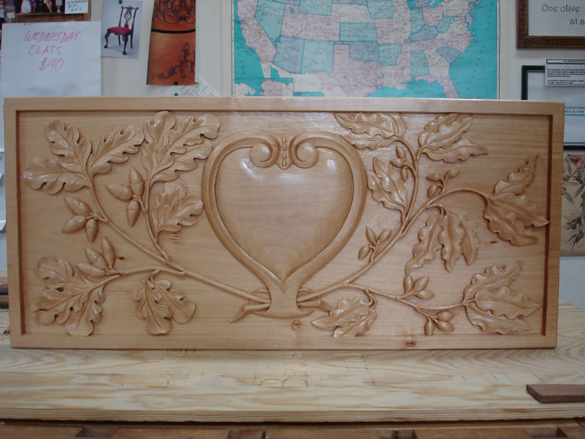 White oak leaves and acorns, carved out of basswood in relief. Note low undercuts in leaves.